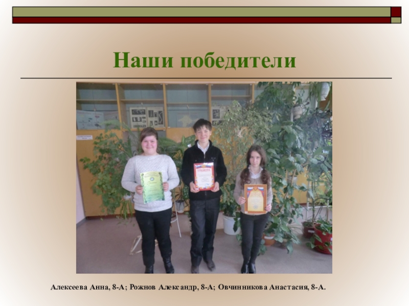 Алексеева Анна, 8-А; Рожнов Александр, 8-А; Овчинникова Анастасия, 8-А.