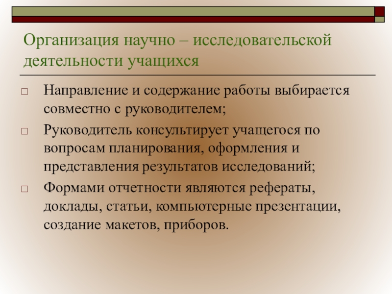 Слайд 6Организация научно – исследовательской деятельности учащихся