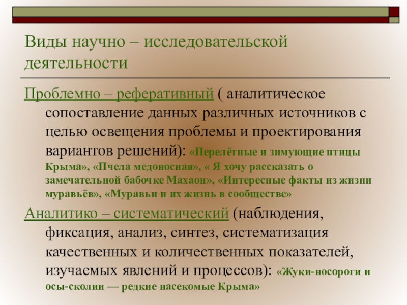Аналитико – систематический (наблюдения, фиксация, анализ, синтез, систематизация качественных и количественных показателей, изучаемых явлений и процессов): «Жуки-носороги и осы-сколии — редкие насекомые Крыма»