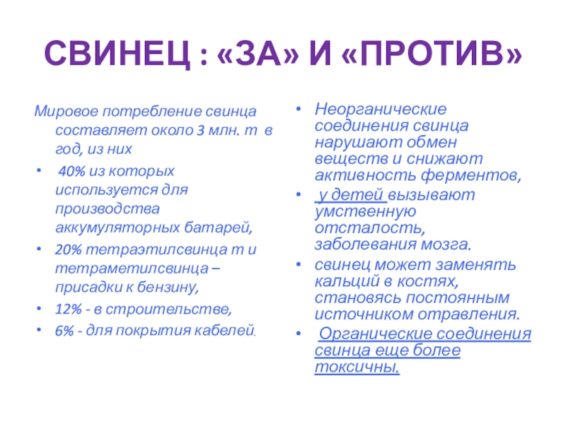 Неорганические соединения свинца нарушают обмен веществ и снижают активность ферментов,