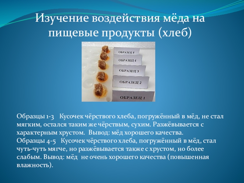 Слайд 15Изучение воздействия мёда на пищевые продукты (хлеб)