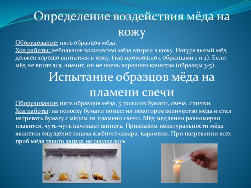 Оборудование: пять образцов мёда, 5 полосок бумаги, свеча, спички.