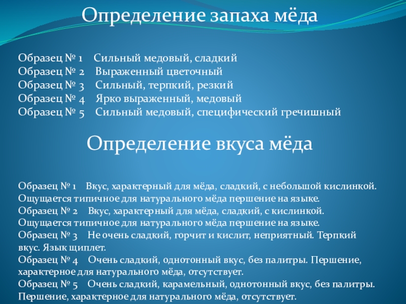 Образец № 1 Вкус, характерный для мёда, сладкий, с небольшой кислинкой. Ощущается типичное для натурального мёда першение на языке.