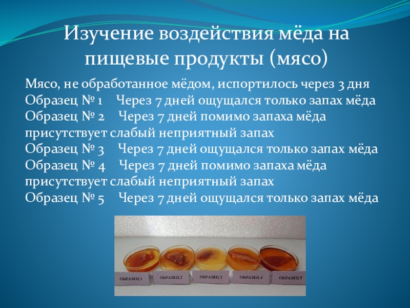 Слайд 14Изучение воздействия мёда на пищевые продукты (мясо)