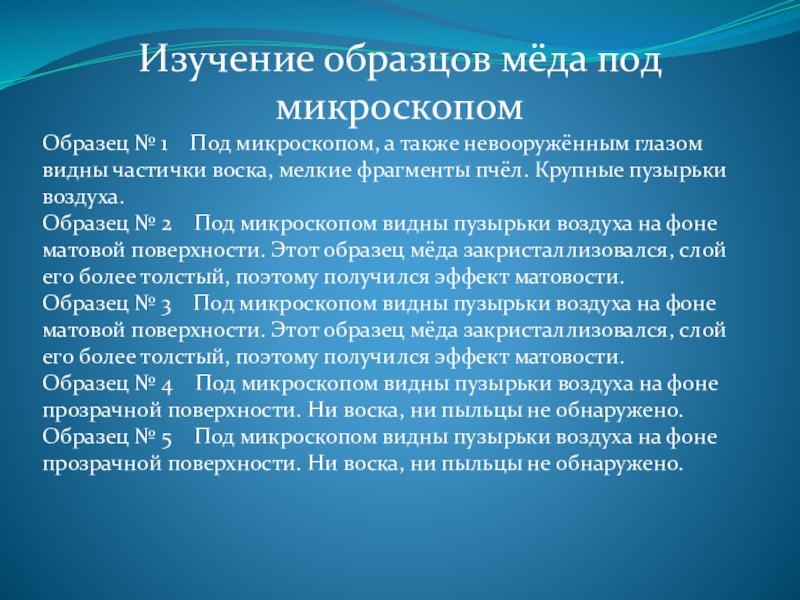 Образец № 5 Под микроскопом видны пузырьки воздуха на фоне прозрачной поверхности. Ни воска, ни пыльцы не обнаружено.