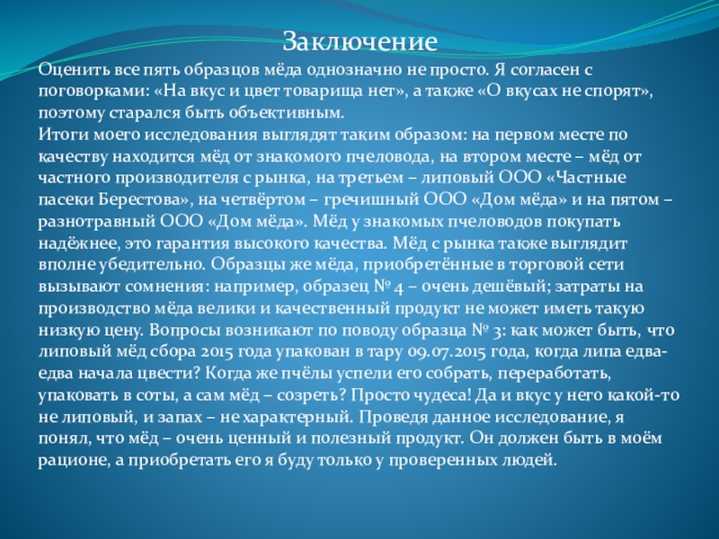 Итоги моего исследования выглядят таким образом: на первом месте по качеству находится мёд от знакомого пчеловода, на втором месте – мёд от частного производителя с рынка, на третьем – липовый ООО «Частные пасеки Берестова», на четвёртом – гречишный ООО «Дом мёда» и на пятом – разнотравный ООО «Дом мёда». Мёд у знакомых пчеловодов покупать надёжнее, это гарантия высокого качества. Мёд с рынка также выглядит вполне убедительно. Образцы же мёда, приобретённые в торговой сети вызывают сомнения: например, образец № 4 – очень дешёвый; затраты на производство мёда велики и качественный продукт не может иметь такую низкую цену. Вопросы возникают по поводу образца № 3: как может быть, что липовый мёд сбора 2015 года упакован в тару 09.07.2015 года, когда липа едва-едва начала цвести? Когда же пчёлы успели его собрать, переработать, упаковать в соты, а сам мёд – созреть? Просто чудеса! Да и вкус у него какой-то не липовый, и запах – не характерный. Проведя данное исследование, я понял, что мёд – очень ценный и полезный продукт. Он должен быть в моём рационе, а приобретать его я буду только у проверенных людей.