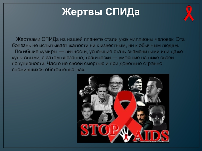 Слайд 7Самым знаменитым человеком, умершим от СПИДа, считается, наверное, легендарный Фредди Меркьюри, вокалист