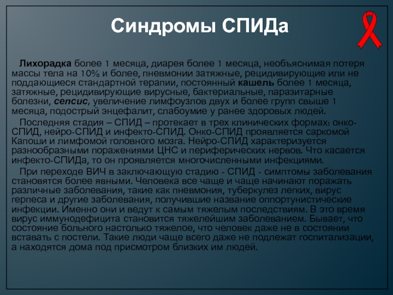При переходе ВИЧ в заключающую стадию - СПИД - симптомы заболевания становятся более явными. Человека все чаще и чаще начинают поражать различные заболевания, такие как пневмония, туберкулез легких, вирус герпеса и другие заболевания, получившие название оппортунистические инфекции. Именно они и ведут к самым тяжелым последствиям. В это время вирус иммунодефицита становится тяжелейшим заболеванием. Бывает, что состояние больного настолько тяжелое, что человек даже не в состоянии вставать с постели. Такие люди чаще всего даже не подлежат госпитализации, а находятся дома под присмотром близких им людей.