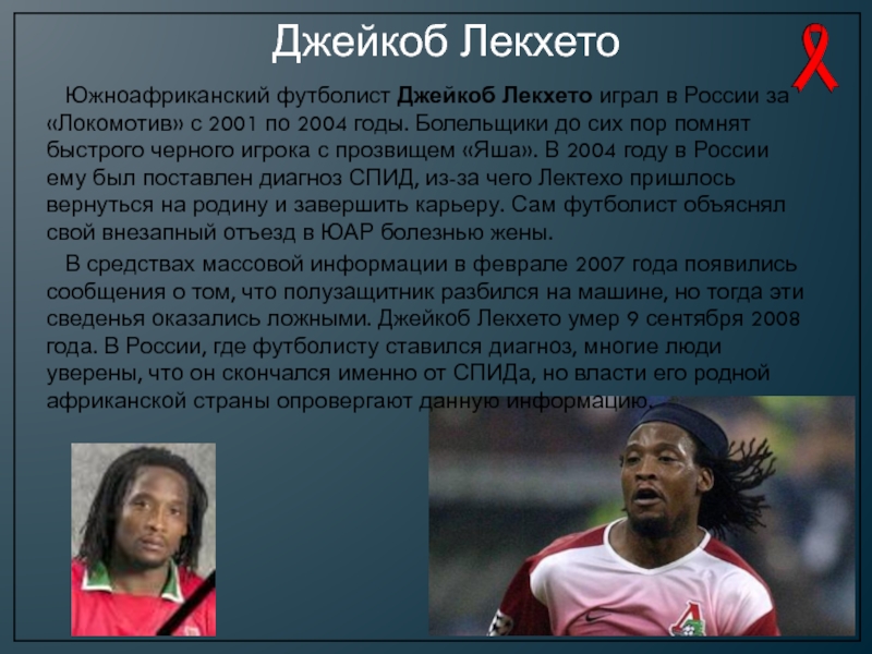 Слайд 8 Южноафриканский футболист Джейкоб Лекхето играл в России за «Локомотив» с 2001