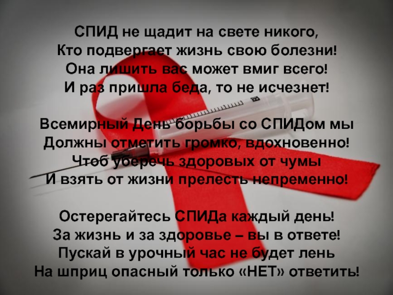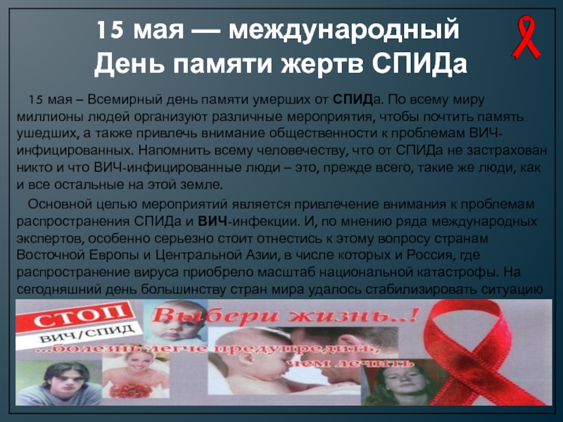 – Всемирный день памяти умерших от СПИДа. По всему миру миллионы людей организуют различные мероприятия, чтобы почтить память ушедших, а также привлечь внимание общественности к проблемам ВИЧ-инфицированных. Напомнить всему человечеству, что от СПИДа не застрахован никто и что ВИЧ-инфицированные люди – это, прежде всего, такие же люди, как и все остальные на этой земле.