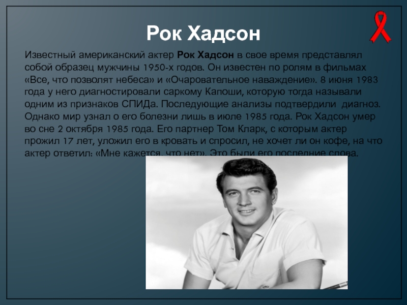 1950-х годов. Он известен по ролям в фильмах «Все, что позволят небеса» и «Очаровательное наваждение». 8 июня 1983 года у него диагностировали саркому Капоши, которую тогда называли одним из признаков СПИДа. Последующие анализы подтвердили диагноз. Однако мир узнал о его болезни лишь в июле 1985 года. Рок Хадсон умер во сне 2 октября 1985 года. Его партнер Том Кларк, с которым актер прожил 17 лет, уложил его в кровать и спросил, не хочет ли он кофе, на что актер ответил: «Мне кажется, что нет». Это были его последние слова.