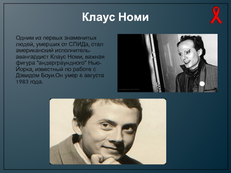 исполнитель-авангардист Клаус Номи, важная фигура "андерграундного" Нью-Йорка, известный по работе с Дэвидом Боуи.Он умер 6 августа 1983 года.