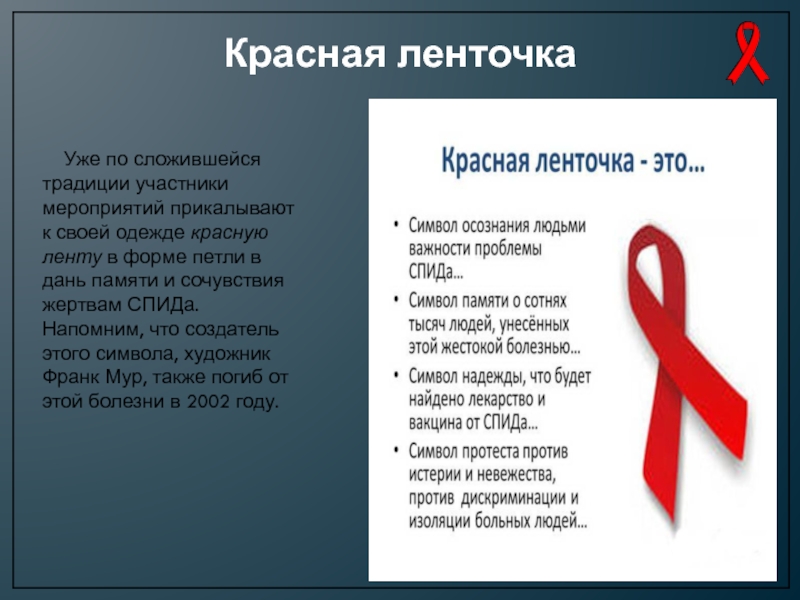 своей одежде красную ленту в форме петли в дань памяти и сочувствия жертвам СПИДа. Напомним, что создатель этого символа, художник Франк Мур, также погиб от этой болезни в 2002 году.