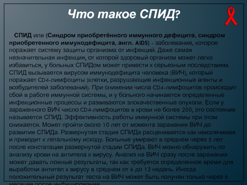 англ. AIDS) - заболевание, которое поражает систему защиты организма от инфекций. Даже самая незначительная инфекция, от которой здоровый организм может легко избавиться, у больных СПИДом может привести к серьезным последствиям. СПИД вызывается вирусом иммунодефицита человека (ВИЧ), который поражает CD4-лимфоциты (клетки, разрушающие инфекционные агенты и возбудителей заболеваний). При снижении числа CD4-лимфоцитов происходит сбой в работе иммунной системы, и у больного начинаются определенные инфекционные процессы и развиваются злокачественные опухоли. Если у зараженного ВИЧ число CD4-лимфоцитов в крови не более 200, это состояние называется СПИД. Эффективность работы иммунной системы при этом снижается. Может пройти около 10 лет от момента заражения ВИЧ до развития СПИДа. Развернутая стадия СПИДа расценивается как неизлечимая и приводит к летальному исходу. Больные умирают в среднем через 5 лет после констатации развернутой стадии СПИДа. ВИЧ можно обнаружить по анализу крови на антитела к вирусу. Анализ на ВИЧ сразу после заражения может давать ложные результаты, так как требуется определенное время для выработки антител к вирусу в среднем от 6 до 12 недель. Иногда положительный результат теста на ВИЧ может быть получен только через 6 месяцев после инфицирования.