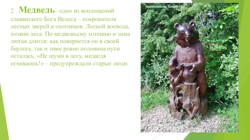 2 . Медведь– одно из воплощений славянского Бога Велеса – покровителя лесных зверей и охотников. Лесной воевода,