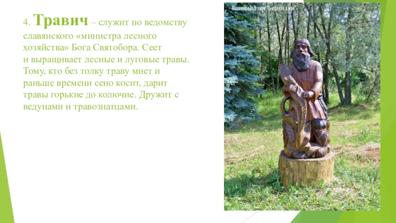Слайд 64. Травич – служит по ведомству славянского «министра лесного хозяйства» Бога Святобора. Сеет и