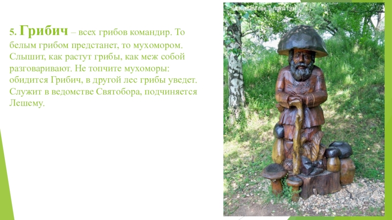 мухомором. Слышит, как растут грибы, как меж собой разговаривают. Не топчите мухоморы: обидится Грибич, в другой лес грибы уведет. Служит в ведомстве Святобора, подчиняется Лешему.