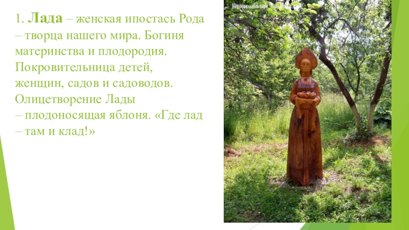 1. Лада – женская ипостась Рода – творца нашего мира. Богиня материнства и плодородия. Покровительница детей, женщин,