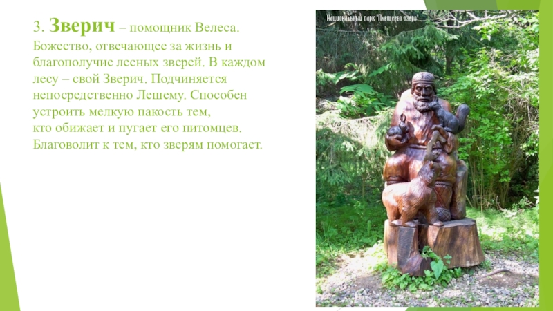 3. Зверич – помощник Велеса. Божество, отвечающее за жизнь и благополучие лесных зверей. В каждом лесу –