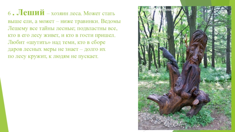 6 . Леший – хозяин леса. Может стать выше ели, а может – ниже травинки. Ведомы Лешему