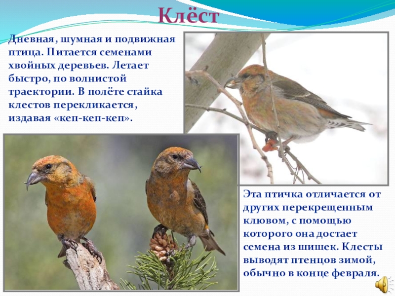 Дневная, шумная и подвижная птица. Питается семенами хвойных деревьев. Летает быстро, по волнистой траектории. В полёте стайка клестов перекликается, издавая «кеп-кеп-кеп».