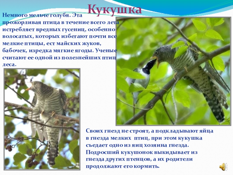 Своих гнезд не строят, а подкладывают яйца в гнезда мелких птиц, при этом кукушка съедает одно из яиц хозяина гнезда. Подросший кукушонок выкидывает из гнезда других птенцов, а их родители продолжают его кормить.