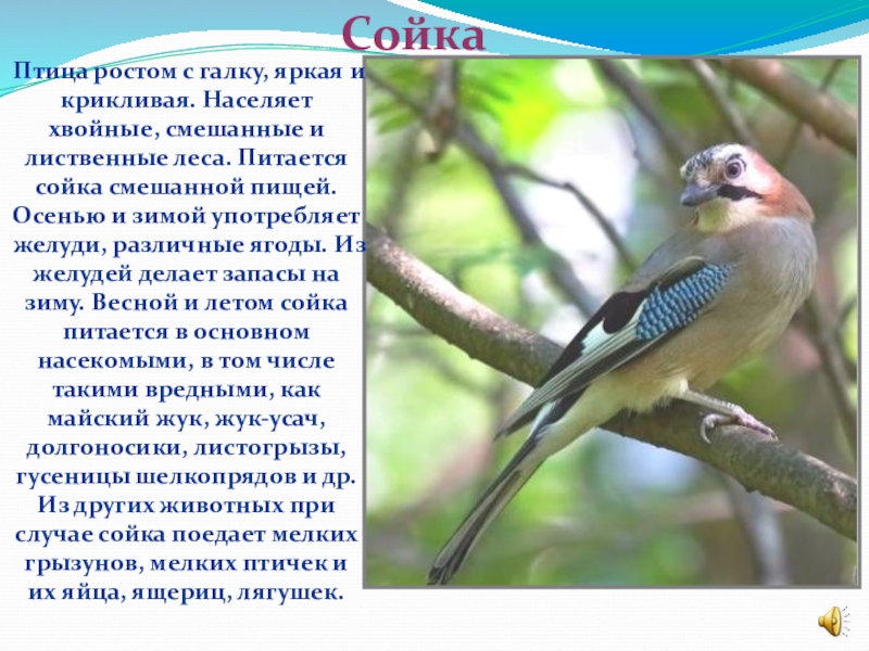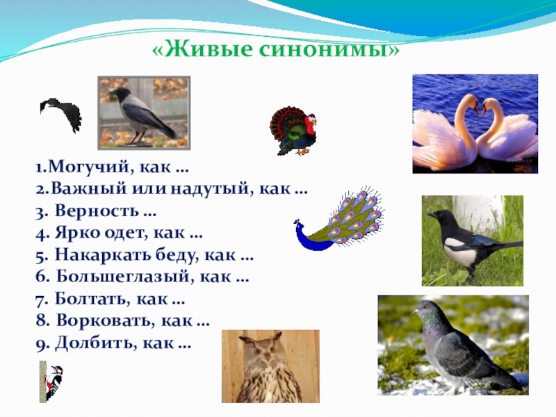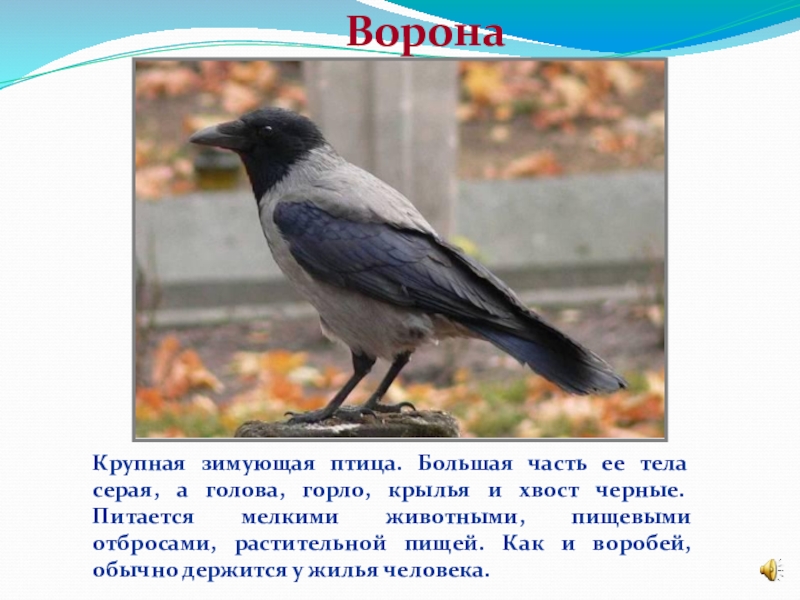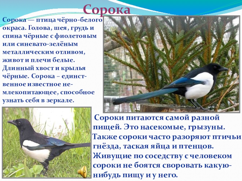 Сорока — птица чёрно-белого окраса. Голова, шея, грудь и спина чёрные с фиолетовым или синевато-зелёным металлическим отливом, живот и плечи белые. Длинный хвост и крылья чёрные. Сорока – единст-венное известное не-млекопитающее, способное узнать себя в зеркале.