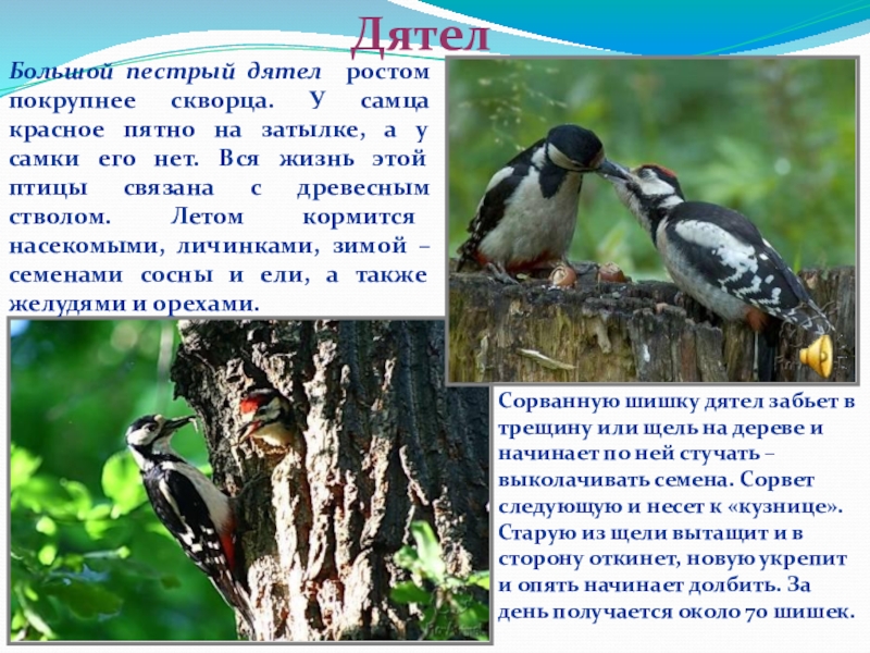 Сорванную шишку дятел забьет в трещину или щель на дереве и начинает по ней стучать – выколачивать семена. Сорвет следующую и несет к «кузнице». Старую из щели вытащит и в сторону откинет, новую укрепит и опять начинает долбить. За день получается около 70 шишек.