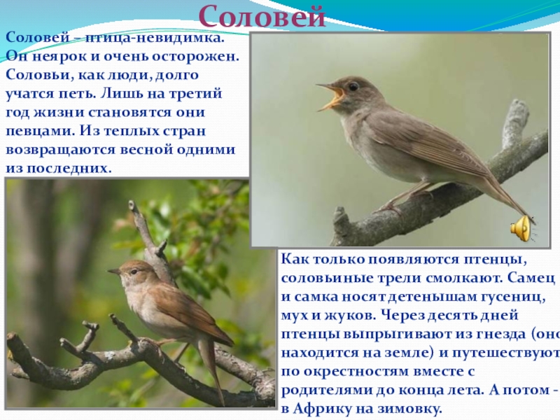 Как только появляются птенцы, соловьиные трели смолкают. Самец и самка носят детенышам гусениц, мух и жуков. Через десять дней птенцы выпрыгивают из гнезда (оно находится на земле) и путешествуют по окрестностям вместе с родителями до конца лета. А потом - в Африку на зимовку.