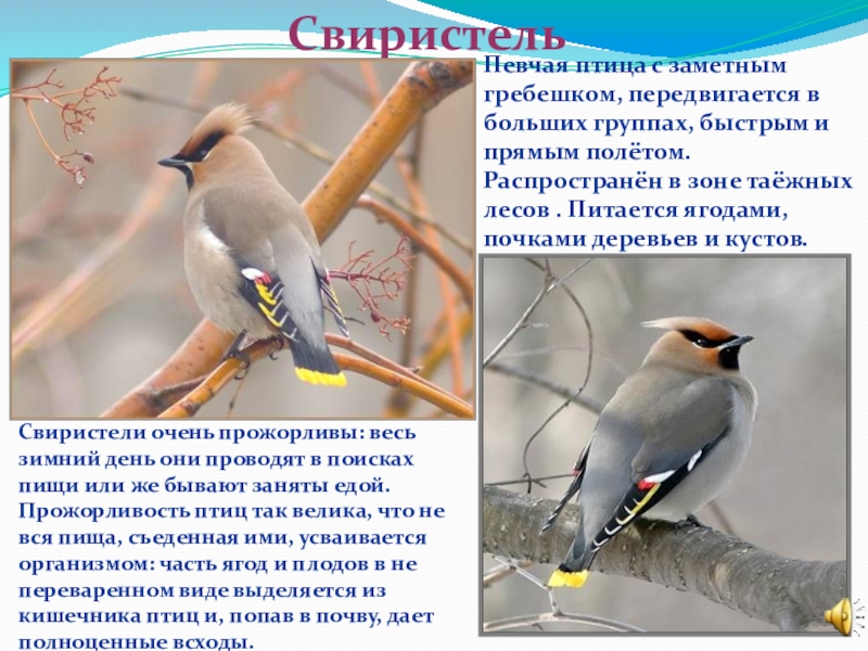 Свиристели очень прожорливы: весь зимний день они проводят в поисках пищи или же бывают заняты едой. Прожорливость птиц так велика, что не вся пища, съеденная ими, усваивается организмом: часть ягод и плодов в не переваренном виде выделяется из кишечника птиц и, попав в почву, дает полноценные всходы.