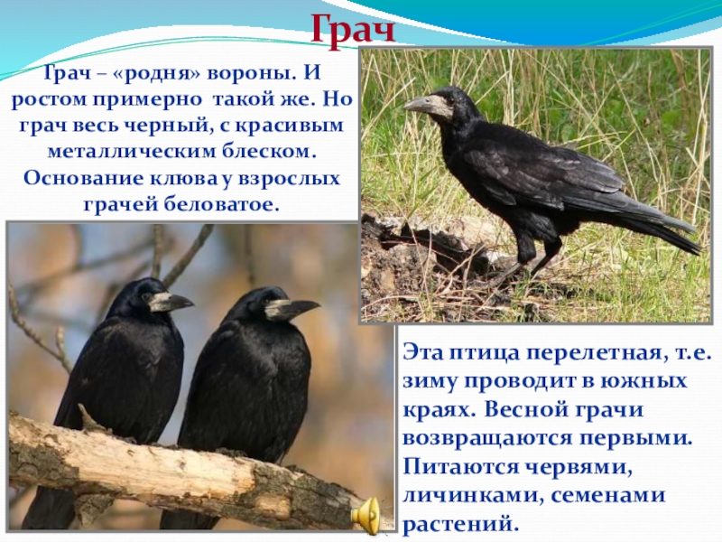 Эта птица перелетная, т.е. зиму проводит в южных краях. Весной грачи возвращаются первыми. Питаются червями, личинками, семенами растений.
