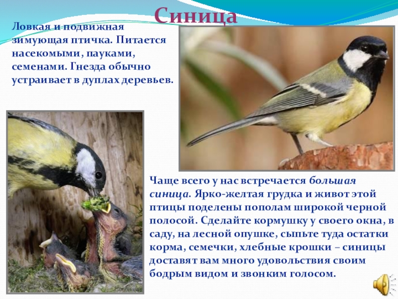 Чаще всего у нас встречается большая синица. Ярко-желтая грудка и живот этой птицы поделены пополам широкой черной полосой. Сделайте кормушку у своего окна, в саду, на лесной опушке, сыпьте туда остатки корма, семечки, хлебные крошки – синицы доставят вам много удовольствия своим бодрым видом и звонким голосом.