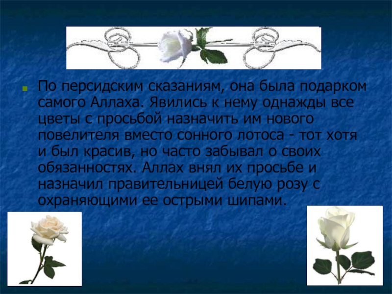 однажды все цветы с просьбой назначить им нового повелителя вместо сонного лотоса - тот хотя и был красив, но часто забывал о своих обязанностях. Аллах внял их просьбе и назначил правительницей белую розу с охраняющими ее острыми шипами.