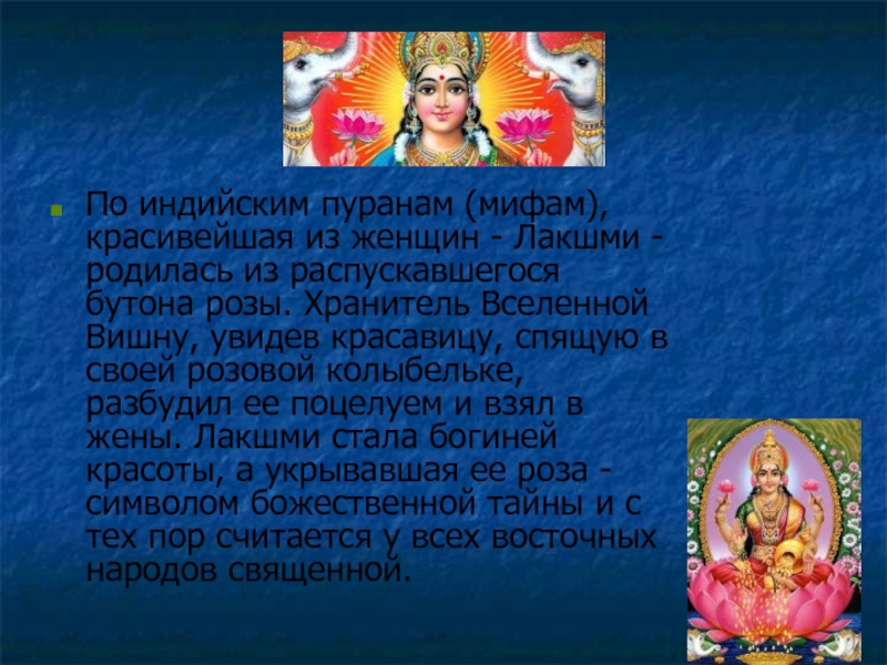 из распускавшегося бутона розы. Хранитель Вселенной Вишну, увидев красавицу, спящую в своей розовой колыбельке, разбудил ее поцелуем и взял в жены. Лакшми стала богиней красоты, а укрывавшая ее роза - символом божественной тайны и с тех пор считается у всех восточных народов священной.