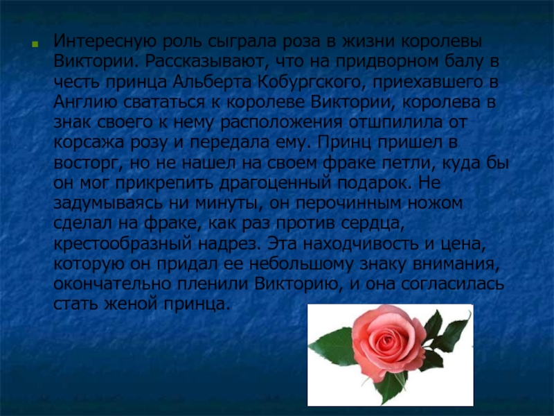 Интересную роль сыграла роза в жизни королевы Виктории. Рассказывают, что на