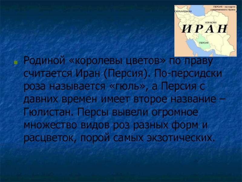 «гюль», а Персия с давних времен имеет второе название – Гюлистан. Персы вывели огромное множество видов роз разных форм и расцветок, порой самых экзотических.