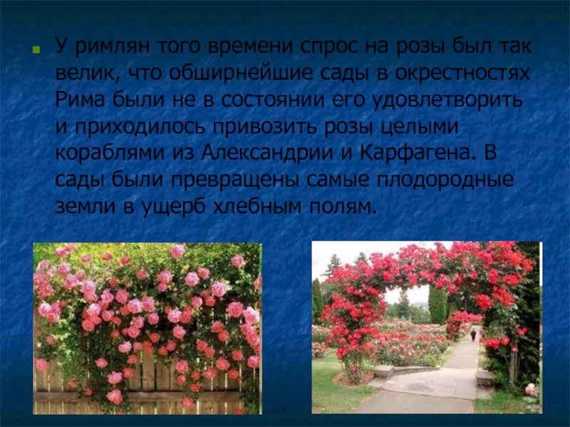 обширнейшие сады в окрестностях Рима были не в состоянии его удовлетворить и приходилось привозить розы целыми кораблями из Александрии и Карфагена. В сады были превращены самые плодородные земли в ущерб хлебным полям.