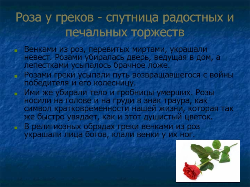 Слайд 10Роза у греков - спутница радостных и печальных торжеств