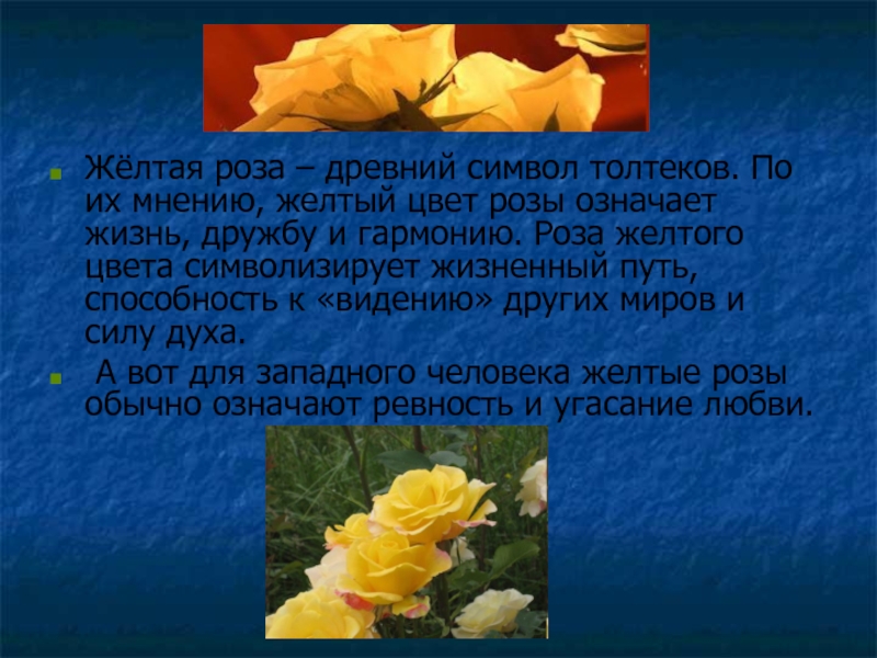 Жёлтая роза – древний символ толтеков. По их мнению, желтый цвет