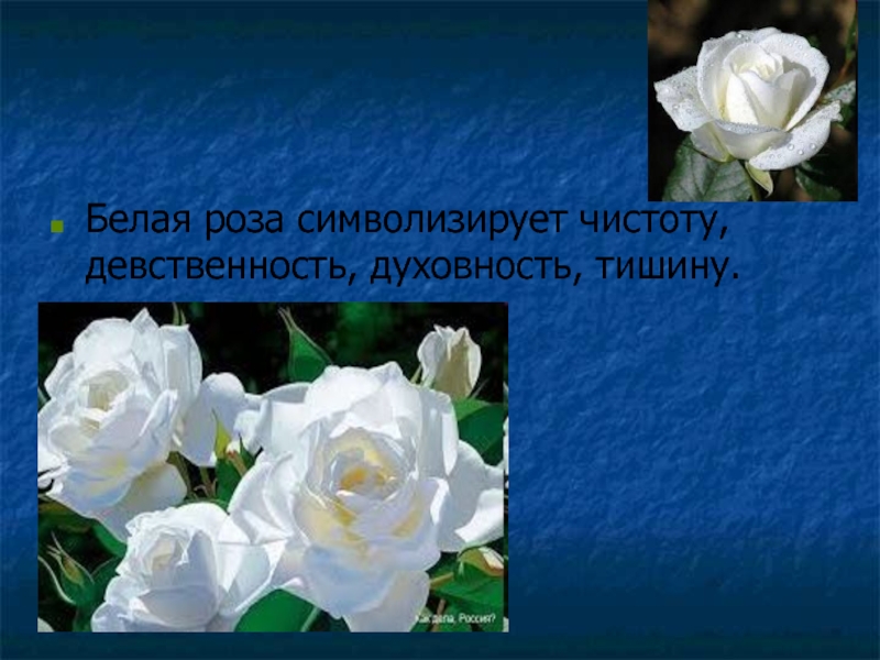 Белая роза символизирует чистоту, девственность, духовность, тишину.