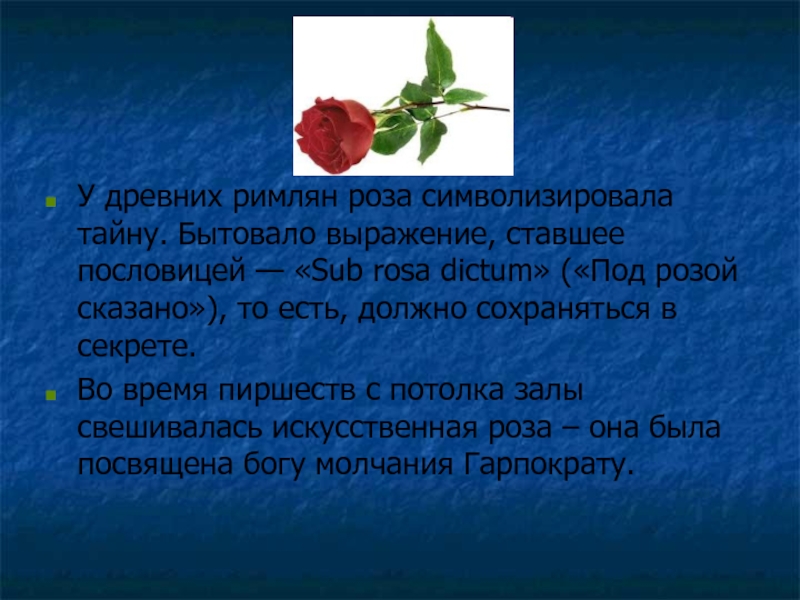 У древних римлян роза символизировала тайну. Бытовало выражение, ставшее пословицей —