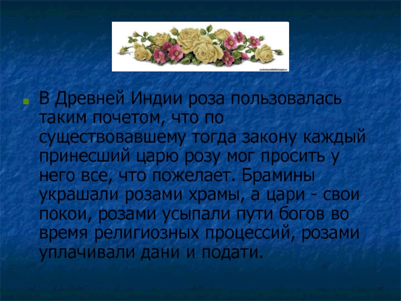 Слайд 2В Древней Индии роза пользовалась таким почетом, что по существовавшему тогда