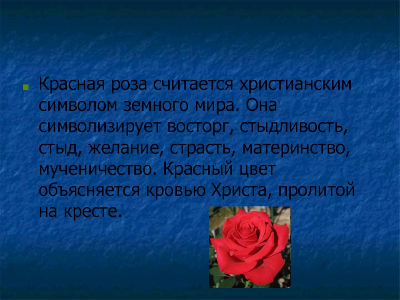 Красная роза считается христианским символом земного мира. Она символизирует восторг, стыдливость,