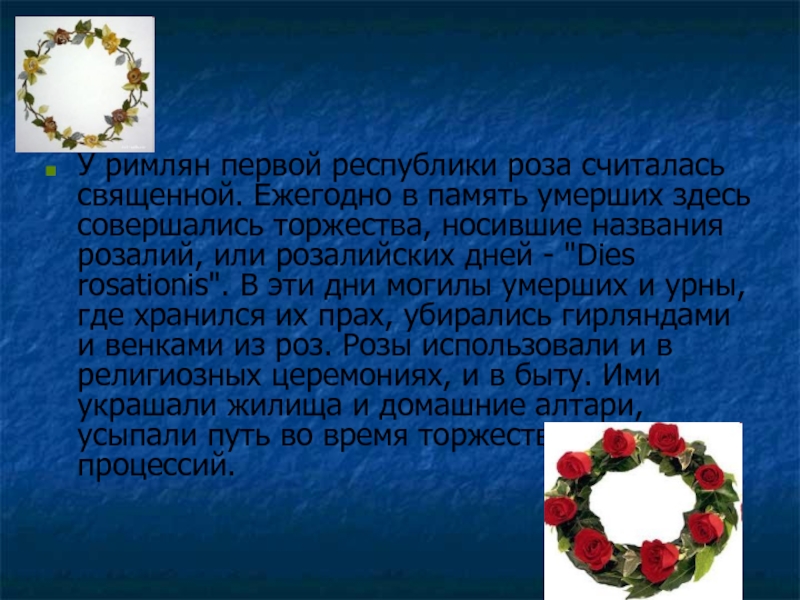 У римлян первой республики роза считалась священной. Ежегодно в память умерших
