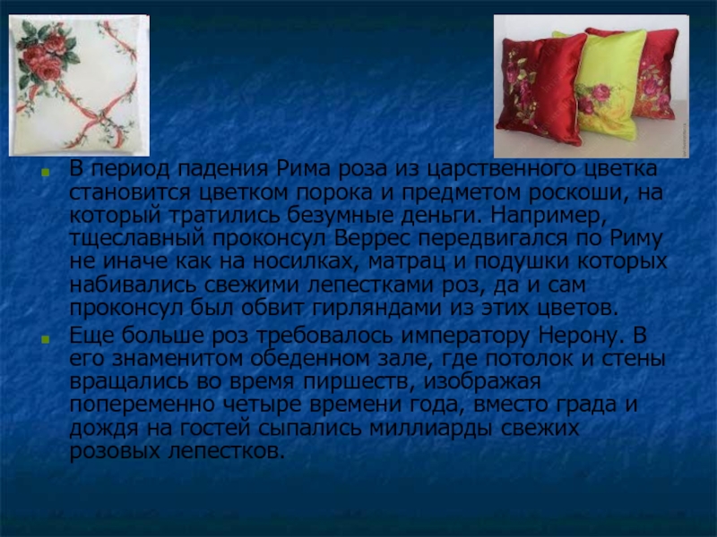 и предметом роскоши, на который тратились безумные деньги. Например, тщеславный проконсул Веррес передвигался по Риму не иначе как на носилках, матрац и подушки которых набивались свежими лепестками роз, да и сам проконсул был обвит гирляндами из этих цветов.