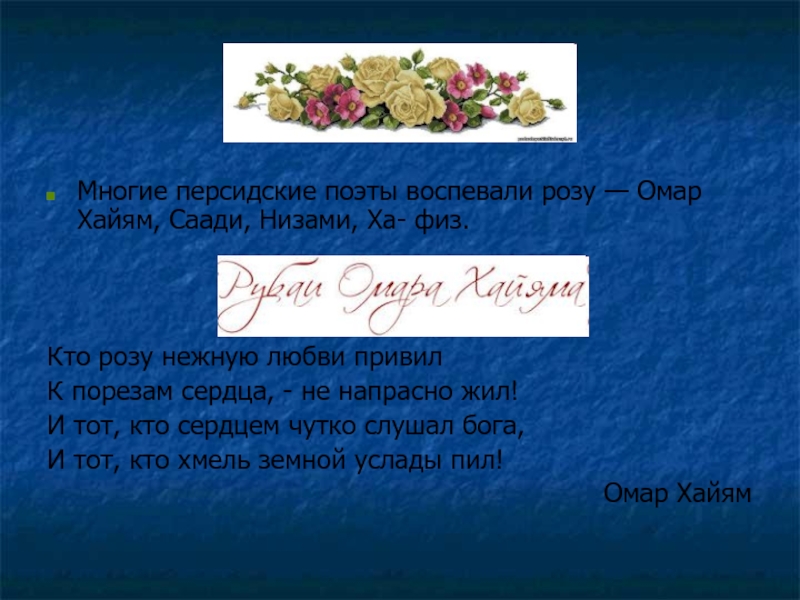 Слайд 5Многие персидские поэты воспевали розу — Омар Хайям, Саади, Низами, Ха-