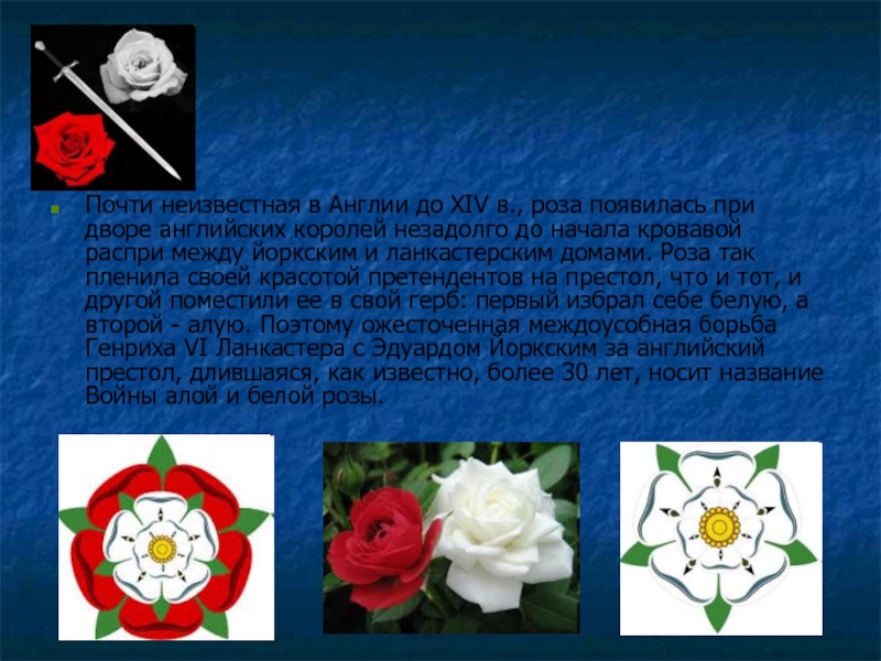 английских королей незадолго до начала кровавой распри между йоркским и ланкастерским домами. Роза так пленила своей красотой претендентов на престол, что и тот, и другой поместили ее в свой герб: первый избрал себе белую, а второй - алую. Поэтому ожесточенная междоусобная борьба Генриха VI Ланкастера с Эдуардом Йоркским за английский престол, длившаяся, как известно, более 30 лет, носит название Войны алой и белой розы.