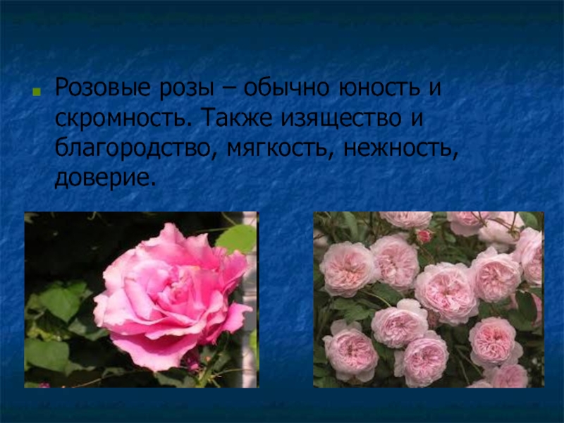 Розовые розы – обычно юность и скромность. Также изящество и благородство,