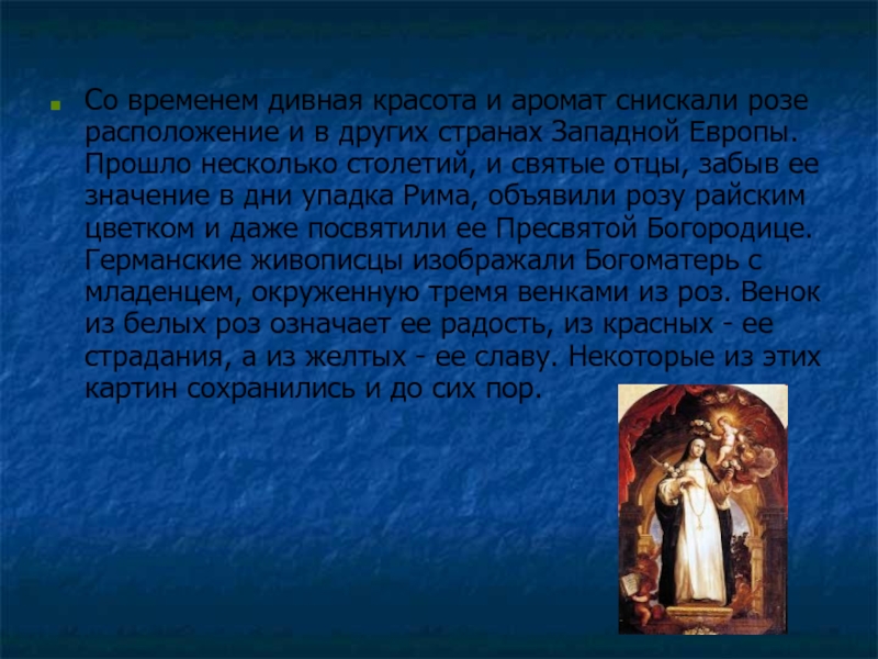 других странах Западной Европы. Прошло несколько столетий, и святые отцы, забыв ее значение в дни упадка Рима, объявили розу райским цветком и даже посвятили ее Пресвятой Богородице. Германские живописцы изображали Богоматерь с младенцем, окруженную тремя венками из роз. Венок из белых роз означает ее радость, из красных - ее страдания, а из желтых - ее славу. Некоторые из этих картин сохранились и до сих пор.