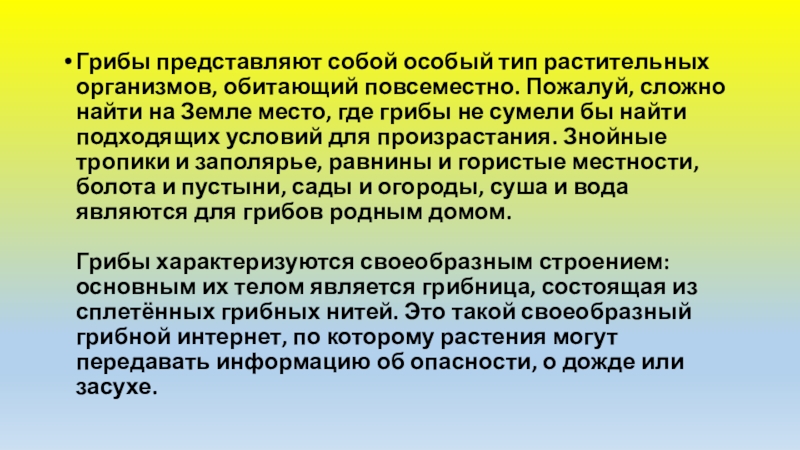 Грибы характеризуются своеобразным строением: основным их телом является грибница, состоящая из сплетённых грибных нитей. Это такой своеобразный грибной интернет, по которому растения могут передавать информацию об опасности, о дожде или засухе.